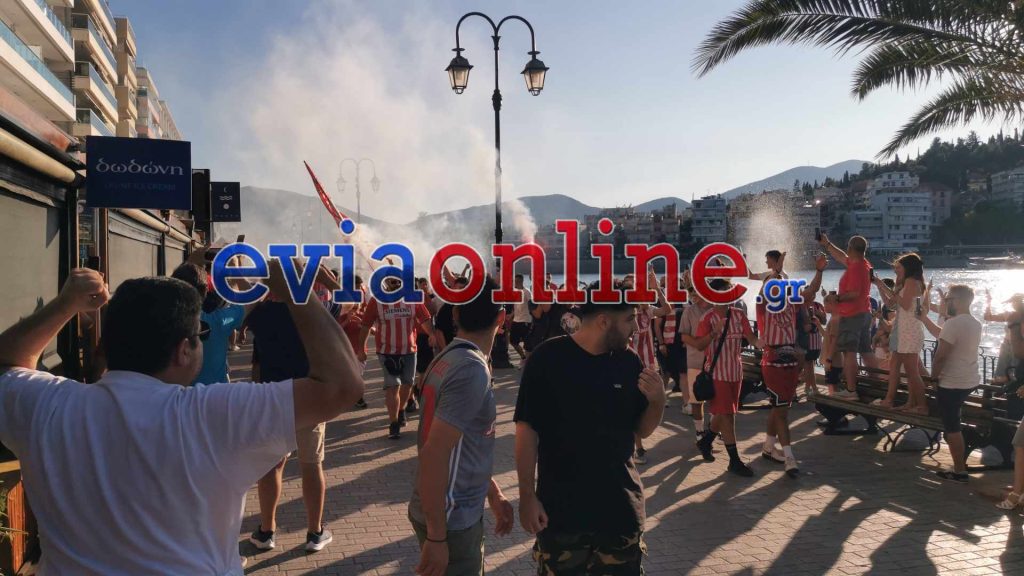 Ερυθρόλευκη λαοθάλασσα μπορεί να χαρακτηρίσει κανείς αυτό που συμβαίνει στην Χαλκίδα, με φιλάθλους του Ολυμπιακού να συγκεντρώνονται στο στρογγυλό της παραλίας με ξέφρενους πανηγυρισμούς, αναμμένους πυρσούς και συνθήματα για την αγαπημένη τους ομάδα.
