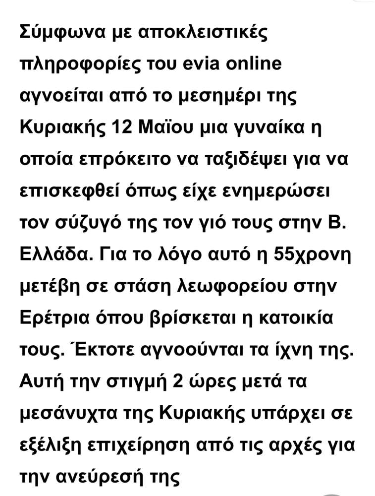 Βρέθηκε πριν λίγο σύμφωνα με αποκλειστικές πληροφορίες του evia online η 55χρονη γυναίκα που αγνοείτο από το μεσημέρι της Κυριακής 12 Μαϊου όταν πήγε στη στάση να πάρει το λεωφορείο για να επισκεφθεί -όπως είχε ενημερώσει τον σύζυγό της -τον γιό τους στην Β. Ελλάδα. Έκτοτε αγνοούνταν τα ίχνη της καθώς το τηλέφωνό της είναι κλειστό. Λίγη ώρα μετά τα μεσάνυχτα της Κυριακής η αστυνομία είχε ξεκινήσει επιχείρηση για την ανεύρεσή της. Τελικά σήμερα το πρωί της Δευτέρας 12 Μαϊου βρέθηκε σε χώρο πλησίον του σπιτιού τους, στην περιοχή της Ερέτριας. Η 55χρονη δεν φέρει τραυματισμό και είναι καλά στην υγεία της.