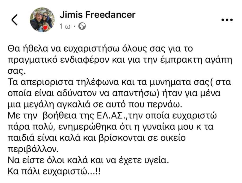 Σοκ προκάλεσε σε όλη την Εύβοια και όχι μόνο η είδηση ότι σύζυγος έκανε ανάρτηση με την οποία ζητούσε να βοηθήσουν όλοι να βρεθεί η γυναίκα του και τα δύο του παιδιά που είχαν εξαφανιστεί από το σπίτι . Αμέσως ένα κύμα συμπαράστασης εκδηλώθηκε προς το πρόσωπό με σχόλια.
