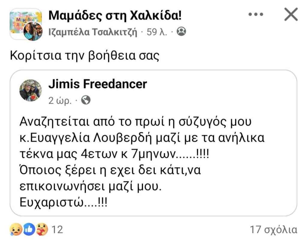 Την σοκαριστική είδηση έκανε γνωστή ο σύζυγός της με ανάρτηση στα μέσα κοινωνικής δικτύωσης, όπου εκφράζει την αγωνία του. Ζητά δε από όποιον γνωρίζει ή έχει δει κάτι να επικοινωνήσει άμεσα μαζί του.