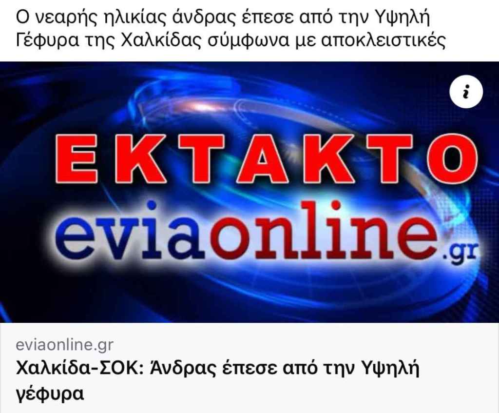 Ο νεαρής ηλικίας άνδρας έπεσε από την Υψηλή Γέφυρα της Χαλκίδας όπως μετέδωσε αποκλειστικά το evia online σήμερα πρωί Δευτέρας 5 Ιανουαρίου λίγο πριν της 9 στην βοιωτική πλευρά με αποτέλεσμα να χάσει την ζωή του. Στο σημείο έσπευσαν αστυνομικές δυνάμεις που έχουν αποκλείσει το χώρο καθώς και ασθενοφόρο του ΕΚΑΒ.