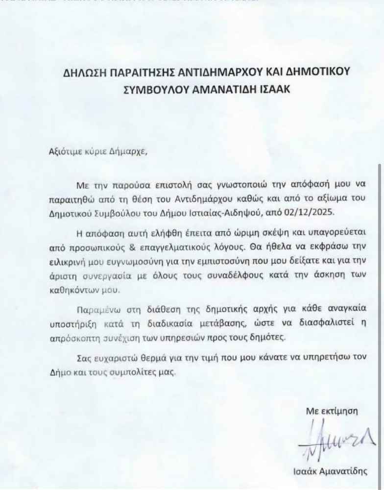 Έκπληξη έχει προκαλέσει σε στελέχη της Τοπικής Αυτοδιοίκησης αλλά και σε δημότες η απόφαση να παραιτηθεί αιφνιδιαστικά από το αξίωμα του αντιδημάρχου αλλά και του δημοτικού συμβούλου ο μέχρι χθες αντιδήμαρχος του Δήμου Ιστιαίας Αιδηψού Ισαάκ Αμανατίδης για προσωπικούς και επαγγελματικούς λόγους