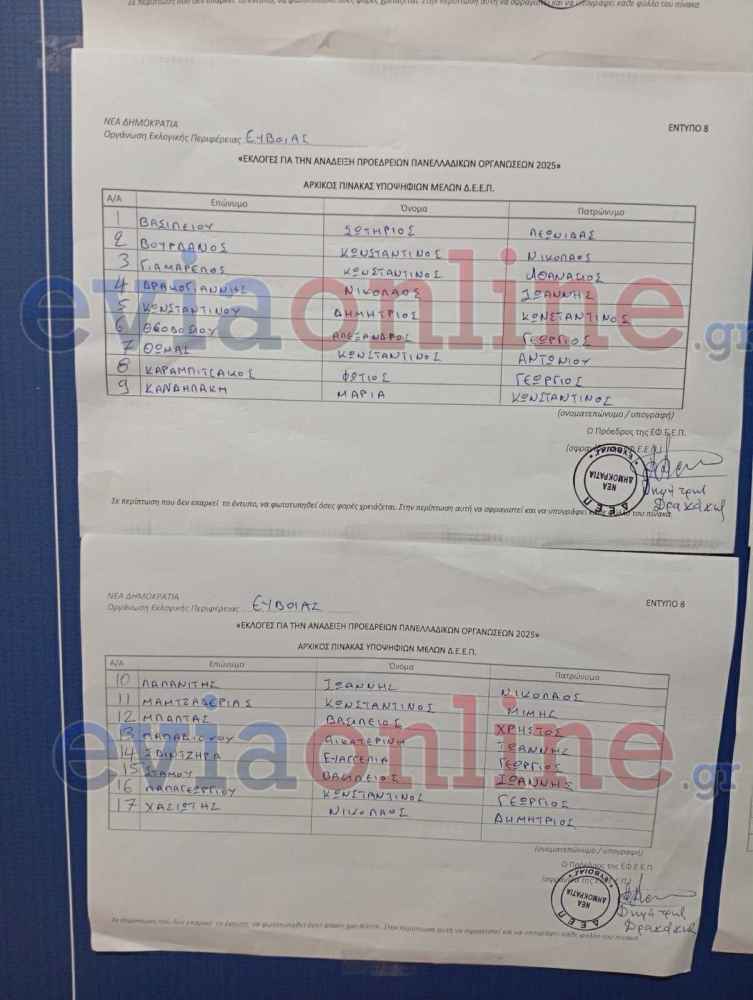 Σήμερα Πέμπτη 30 Οκτωβρίου 2025 ώρα 19:00. έληξε η προθεσμία για την υποβολή υποψηφιοτήτων για τα μέλη της ΔΕΕΠ. Μέχρι τελευταία στιγμή προσέρχονταν στα γραφεία της ΔΕΕΠ Εύβοιας στη Χαλκίδα κομματικά στελέχη. Η λίστα των υποψηφίων είναι σύμφωνα με πληροφορίες του evia online η ακόλουθη: