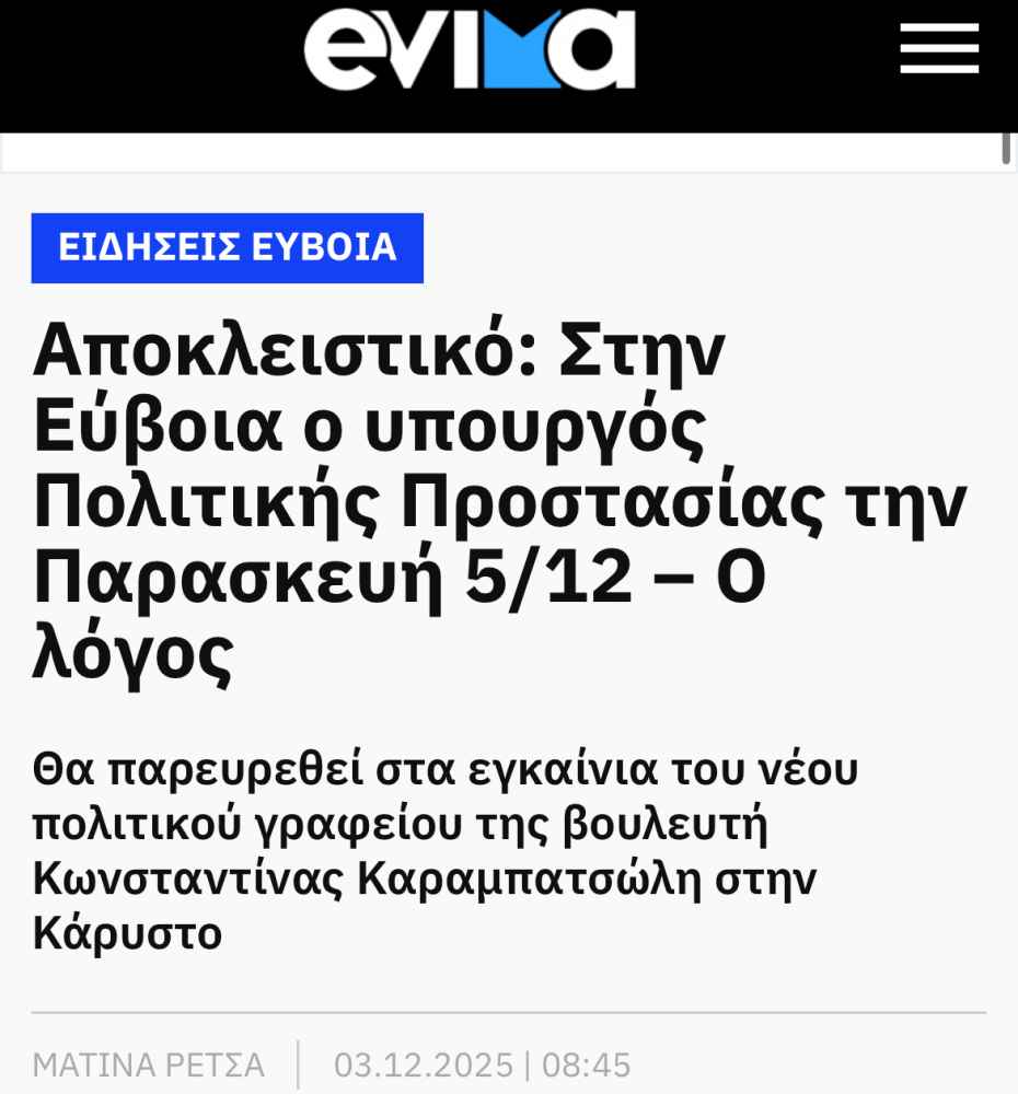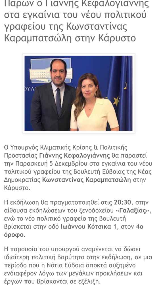 Μάλιστα ένα έβαλε τίτλο υποτιμώντας την νοημοσύνη των Ευβοιωτών, καθώς άφηνε να εννοηθεί ότι αφήνει το υπουργείο και έρχεται για τα εγκαίνια του πολιτικού γραφείου της μεγαλυτέρας πολιτικού όλων των εποχών (και των τεσσάρων) της αυτού Μεγαλειότητος Κωσταντίνας Καραμπατσώλη της Α και προφανώς τελευταίας.