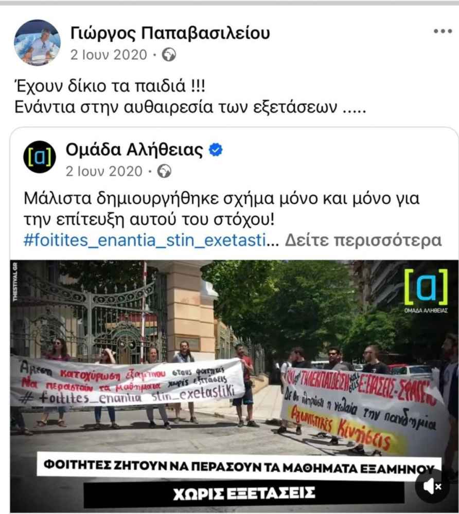 Συγκεκριμένα ο κ. Παπαβασιλείου τον Νοέμβριο του 2020 και με αφορμή περιστατικά βίας σε πανεπιστήμια έγραφε: «Εξαιρετικός Μητσοτάκης, για το φασιστικό παρακράτος των πανεπιστημίων με αριστερό προσωπείο».