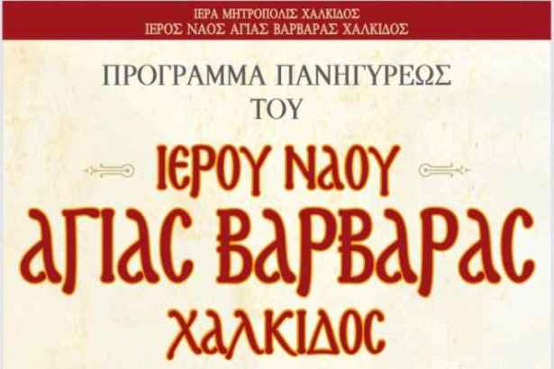 Γνωστοποιείται σε κάθε φιλακόλουθο χριστιανό ότι απόψε, Παρασκευή, 28 Νοεμβρίου 2025, στις 8μ.μ., στον Ιερό Ναό αγίας Βαρβάρας Χαλκίδος, πρόκειται να τελεσθεί ιερά αγρυπνία, η οποία θα είναι και η εναρκτήρια λατρευτική σύναξη των εορταστικών εκδηλώσεων επί τη μνήμη της αγίας Βαρβάρας.