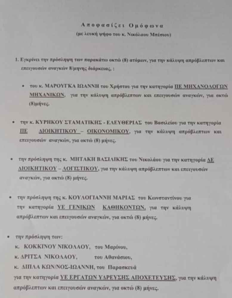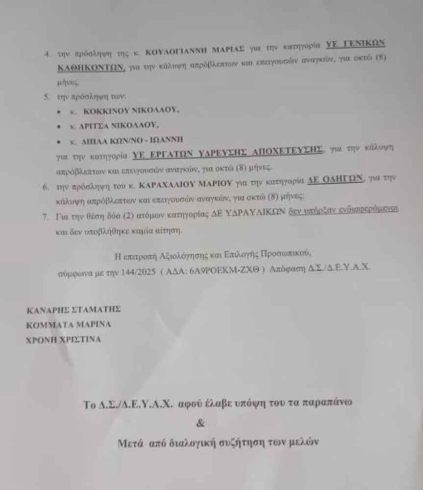 Η απόφαση της τριμελούς επιτροπής της ΔΕΥΑΧ που ενέταξε στους προσληφθέντες τη θείτσα της προέδρου Ι. Δαριβέρη όπως είναι αναρτημένη στην ΔΙΑΥΓΕΙΑ.
