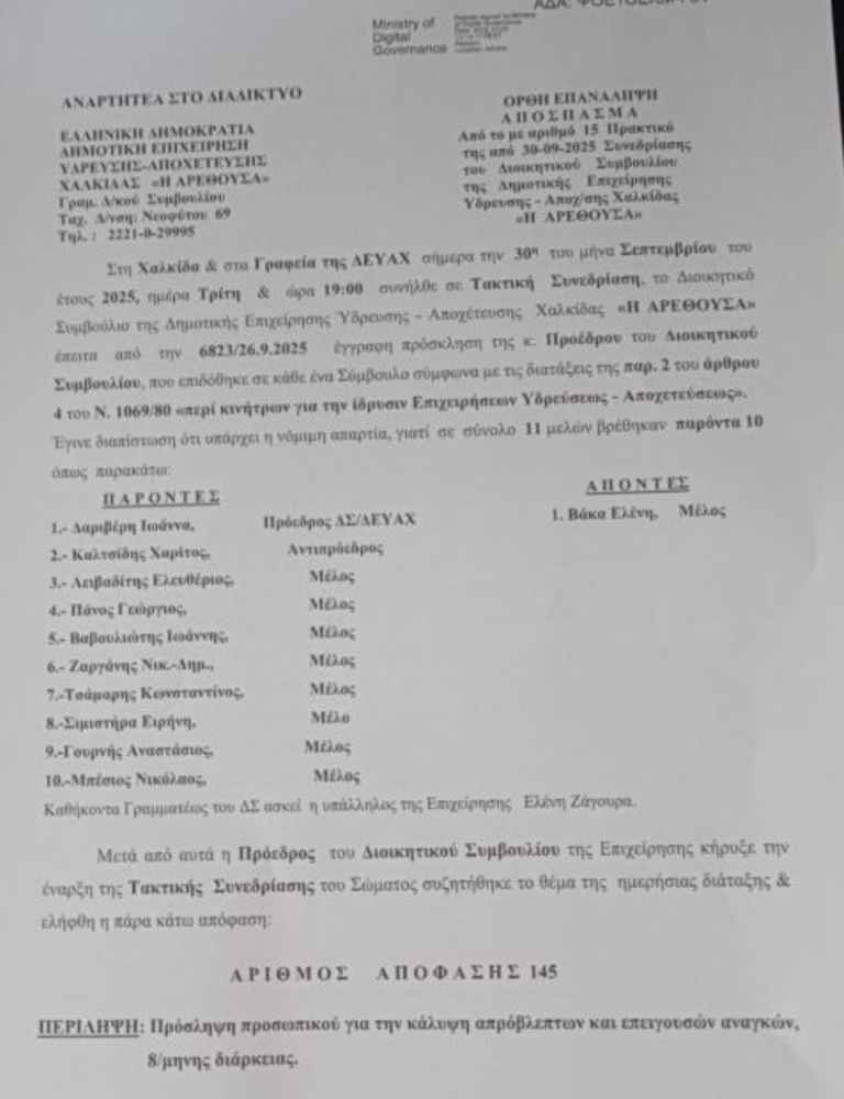 Η Αποκεντρωμένη Διοίκηση που έχει την αρμοδιότητα για σχετικά θέματα, έχει στείλει την απόφαση του Δ.Σ. της ΔΕΥΑΧ στην εφημερίδα της κυβερνήσεως, που την δημοσιεύει στις 25 Αυγούστου!!! Από πότε θα πάρει τα χιλιάρικα η Τζοάννα; Από τον Ιούνιο!