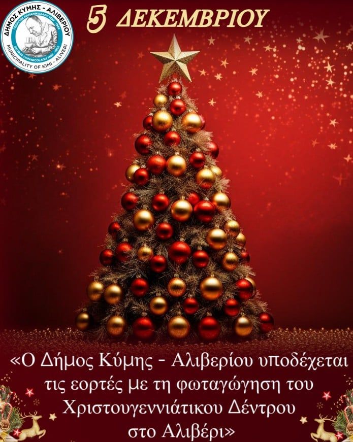 Ο Δήμος Κύμης – Αλιβερίου προσκαλεί τους πολίτες την Παρασκευή 5 Δεκεμβρίου στο Αλιβέρι, για μια ζεστή και λαμπερή έναρξη της εορταστικής περιόδου. Η εκδήλωση, αφιερωμένη στο φως και στη χαρά των Χριστουγέννων, υπόσχεται μια μαγική βραδιά για μικρούς και μεγάλους.