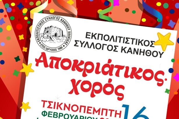 Αποκριάτικο χορό διοργανώνει ο Εκπολιτιστικός Σύλλογος Κανήθου την Τσικνοπέμπτη 16 Φεβρουαρίου στο κοσμικό κέντρο «Ποσειδωνία» στον Καράμπαμπα, ώρα έναρξης 9 το βράδυ, με τα «Χάλκινα Δυτικής Μακεδονίας». Είσοδος 18 ευρώ, για περισσότερες πληροφορίες – κρατήσεις τηλ. 6974483261