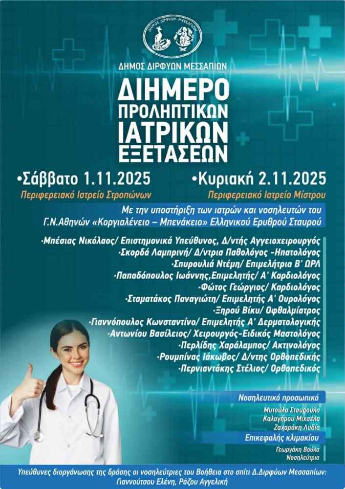 Οι εξετάσεις συνεχίζονται την Κυριακή 2 Νοεμβρίου 2025, στο Περιφερειακό Ιατρείο Μίστρου, όπου γιατροί και νοσηλευτές από το νοσοκομείο θα βρίσκονται ξανά στη διάθεση των κατοίκων για δωρεάν προληπτικό έλεγχο.