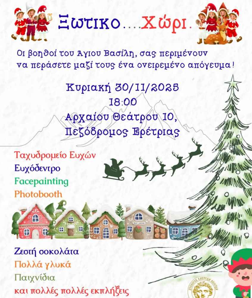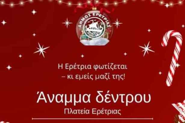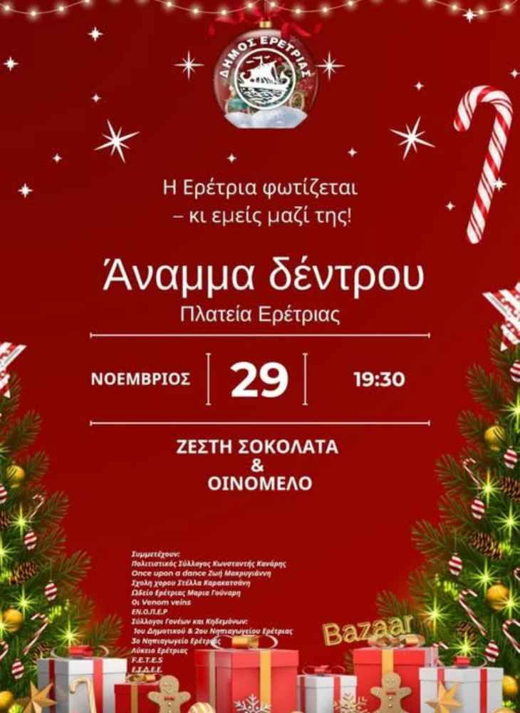 29/11/2025 και ώρα 19:30 Άναμμα Δέντρου στη πλατεία Ερέτριας απο τον Δήμο Ερέτριας και τους συλλόγους της περιοχής.