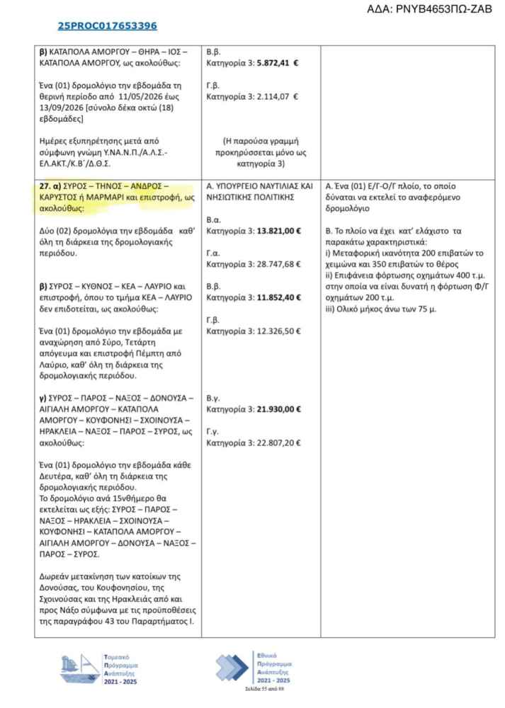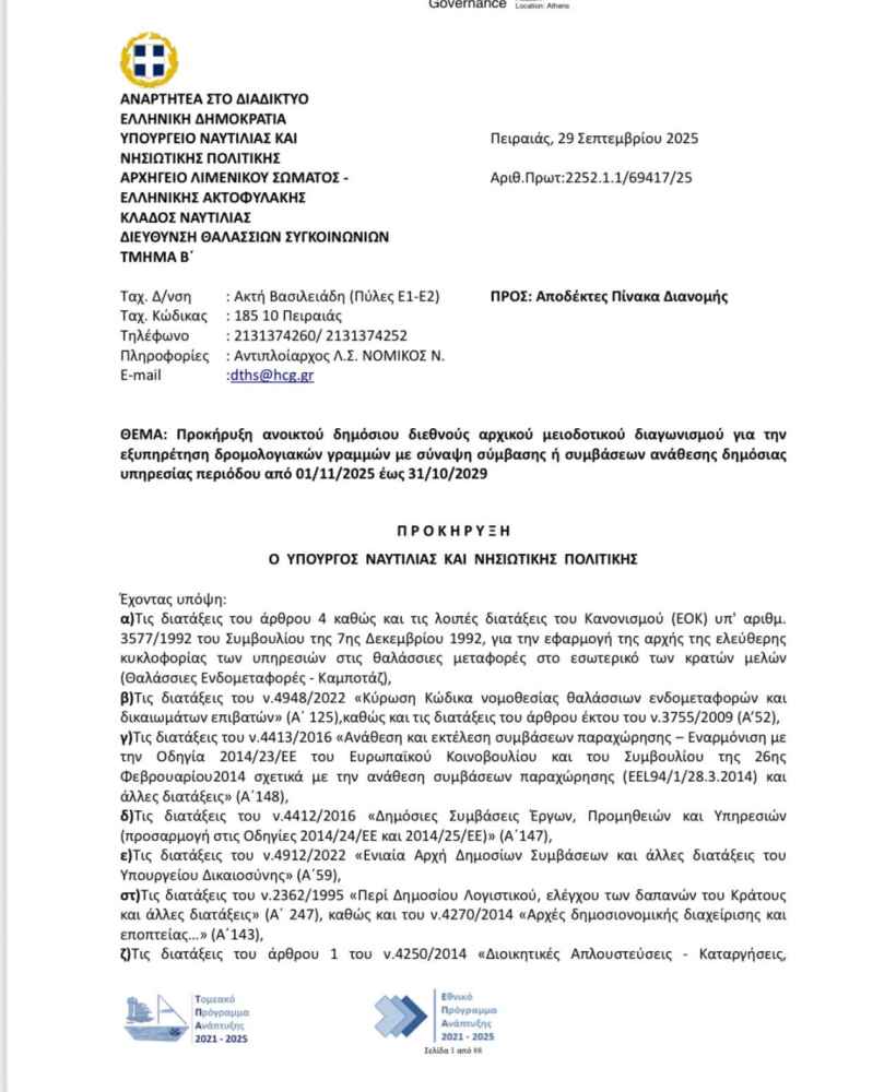 Προκηρύχθηκε ο διαγωνισμός για την εξυπηρέτηση της ακτοπλοϊκής γραμμής Σύρος – Τήνος – Άνδρος – Κάρυστος ή Μαρμάρι.