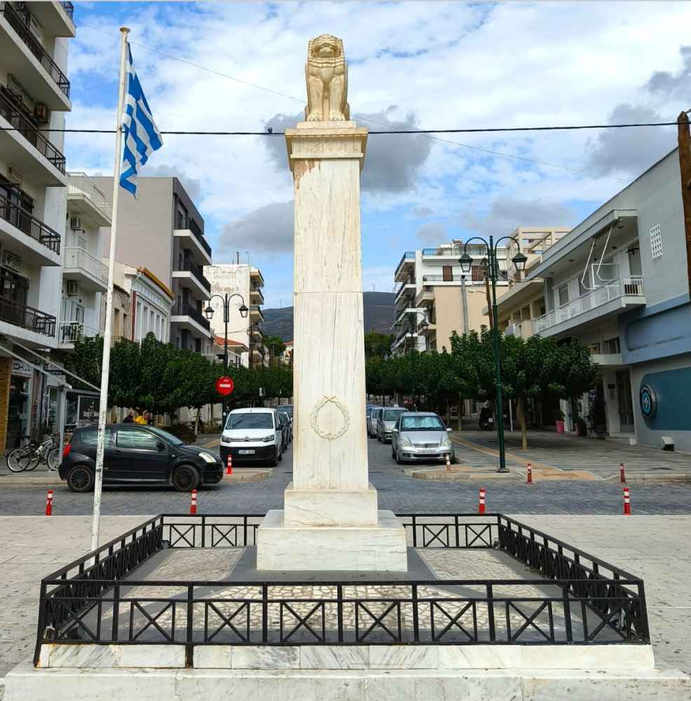 - 1928: Ανάθεση στον γλύπτη Επ. Μαυρουδή (πεντελικό μάρμαρο) • Μηχανικός: Κ. Ηλ. Μπίρης • Χρηματοδότηση: από την Αδελφότητα, τη Διασπορά και τον Δήμο • 1930: Ολοκλήρωση – αποκαλυπτήρια με Γ. Παπανδρέου • 1980: Προσθήκη ονομάτων πεσόντων του ’40–’41