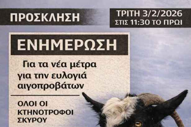 Ανοιχτή ενημερωτική συνάντηση για όλους τους κτηνοτρόφους της Σκύρου διοργανώνει ο Δήμος με αφορμή τα νέα μέτρα που ισχύουν για την ευλογιά των αιγοπροβάτων. Η συνάντηση θα πραγματοποιηθεί την Τρίτη 3/2, στις 11:30, στην αίθουσα συνεδριάσεων του Δημοτικού Συμβουλίου.