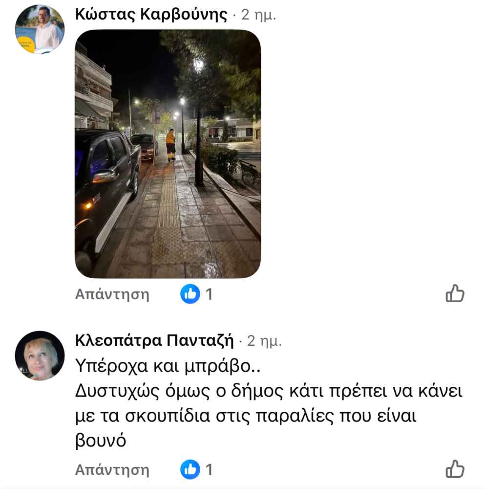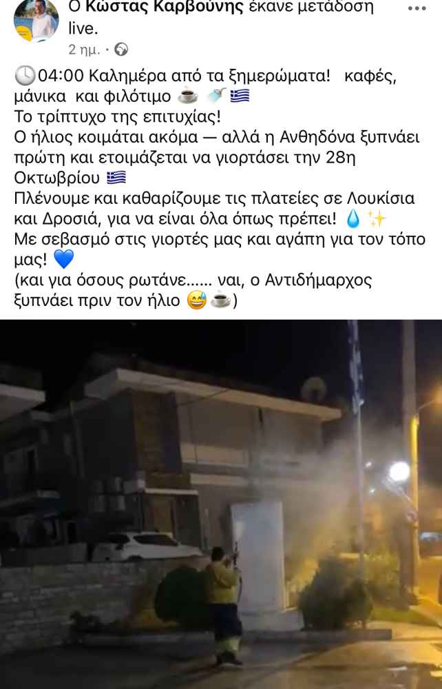 “Της νύχτας τα καμώματα τα βλέπει η ημέρα και γελά.” Προφανώς ο Κώστας Καρβούνης που ήθελε να δείξει ότι δικαιολογεί τον μισθό του ως αντιδήμαρχος (2500 ευρώ μικτά) εμφανίστηκε μαζί με τους υπαλλήλους καθαριότητας ότι είναι μαζί τους, την στιγμή που καθαρίζουν εν όψει της εθνικής επετείου της 28ης Οκτωβρίου.