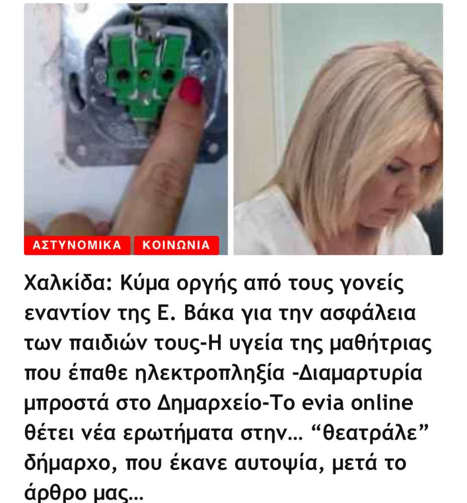 >>>Δήμος Χαλκιδέων-ΣΟΚ : Ο… εν αναμονή δήμαρχος Β. Γουρνής, η ηλεκτροπληξία της μαθήτριας και η πυρασφάλεια στα σχολεία-Καυτά ερωτήματα στον αντ’ αυτού, της κρυπτόμενης Ελ. Βάκα, για την ασφάλεια των παιδιών, από το evia online
