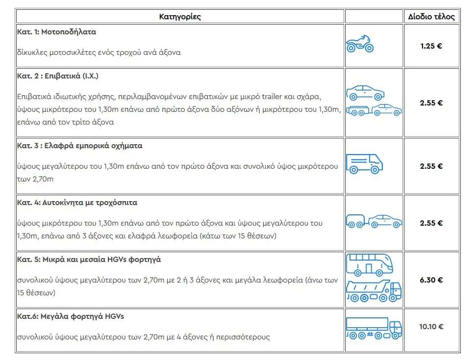 Κατηγορία 1 – Μοτοποδήλατα: Δίκυκλες μοτοσυκλέτες ενός τροχού ανά άξονα: 1,25 ευρώ.
