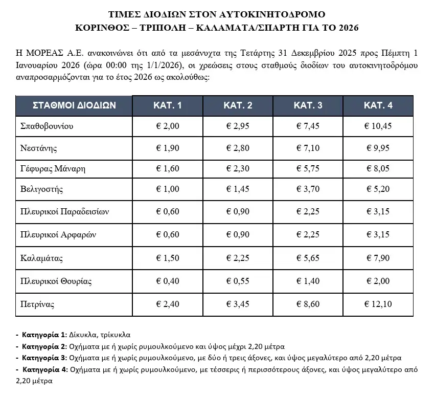 Στο μεταξύ, η Ολυμπία Οδός (Αθήνα-Πύργος) και ο Μορέας (Κόρινθος-Καλαμάτα/Σπάρτη), ανακοίνωσαν εξίσου αύξηση στις τιμές των διοδίων από την Πέμπτη 1η Ιανουαρίου 2026 (ώρα 00:00) λόγω της ετήσιας τιμαριθμικής προσαρμογής που εφαρμόζουν οι παραχωρησιούχοι των οδικών αξόνων.
