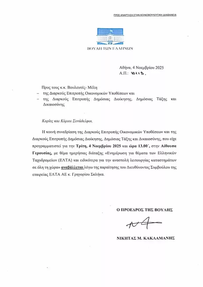 Ο πρόεδρος της Βουλής Νικήτας Κακλαμάνης ανακοίνωσε ότι αναβάλλεται μέχρι να οριστεί ο νέος διευθύνων σύμβουλος.