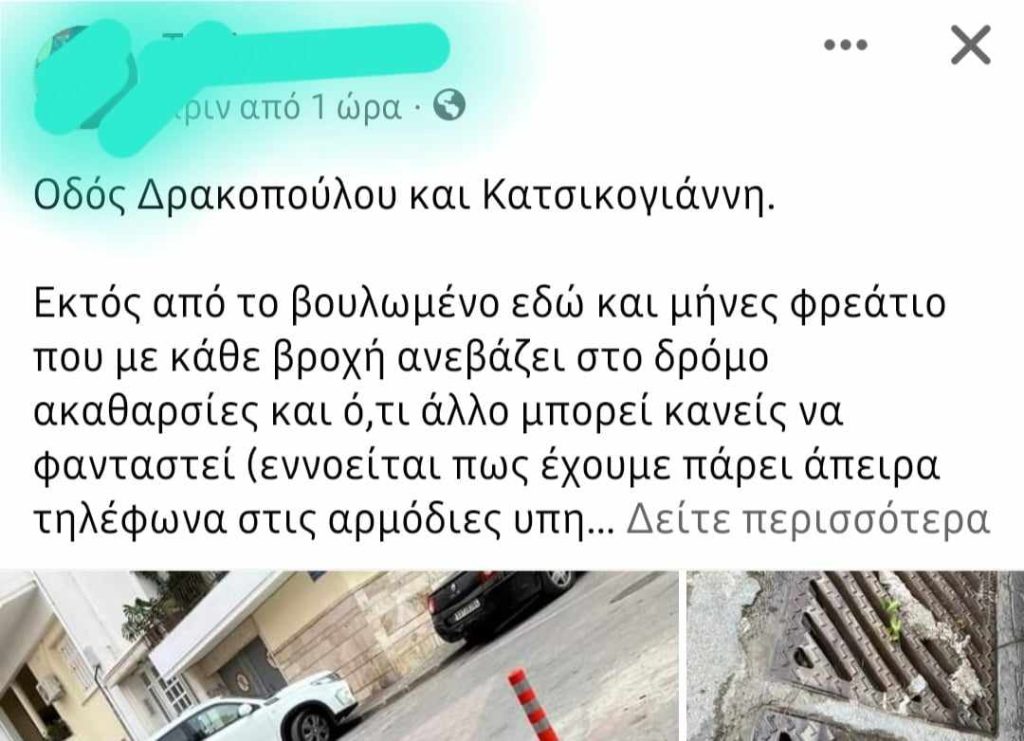 Αρκετά είναι τα προβλήματα που αντιμετωπίζουν όσοι διαμένουν στην συγκεκριμένη περιοχή της Χαλκίδας, (Οδός Δρακοπούλου και Κατσικογιάννη), καθώς σύμφωνα με τα όσα αναφέρει σε ανάρτησή της κάτοικος, εδώ και μήνες υπάρχει βουλωμένο φρεάτιο που με κάθε βροχή ανεβάζει στο δρόμο ακαθαρσίες και ό,τι άλλο μπορεί κανείς να φανταστεί και πριν λίγες μέρες προστέθηκαν και κολωνάκια όπου αφαιρούν 3 θέσεις στάθμευσης, για ένα φορτηγό που έρχεται 2-3 φορές το χρόνο να καθαρίζει την παραλία, όπως υποστηρίζει.
