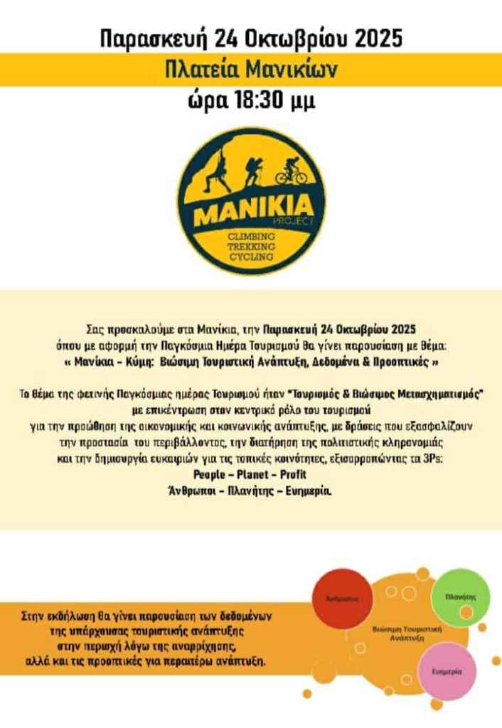Την Παρασκευή 24 Οκτωβρίου 2025, στις 18:30 μ.μ., στην Πλατεία Μανικιών, θα πραγματοποιηθεί εκδήλωση με αφορμή την Παγκόσμια Ημέρα Τουρισμού, με θέμα: