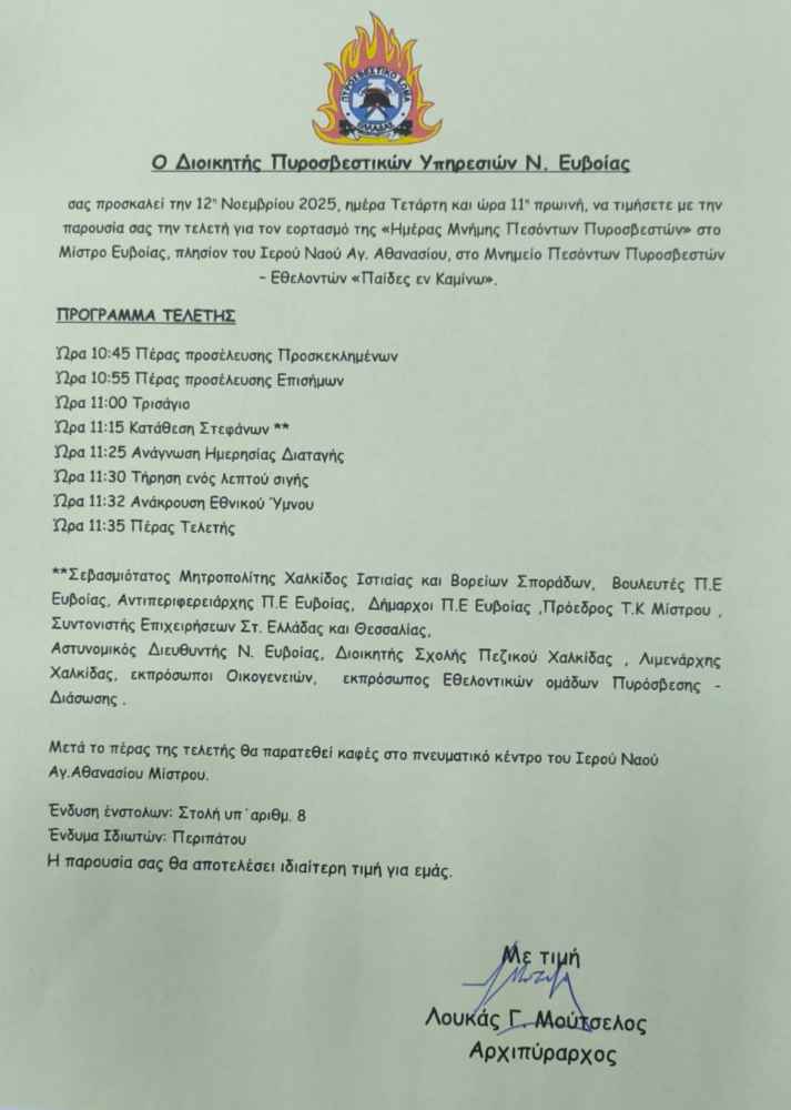 Η τελετή θα λάβει χώρα στο Μίστρο Ευβοίας, πλησίον του Ιερού Ναού Αγίου Αθανασίου, στο Μνημείο Πεσόντων Πυροσβεστών – Εθελοντών “Παίδες εν Καμίνω”.