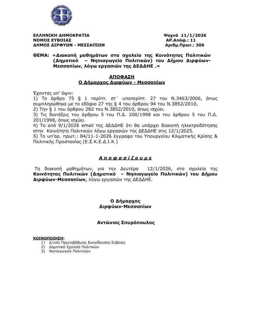 Η κακοκαιρία που θα ενσκύψει στην Εύβοια τις επόμενες ώρες με θυελλώδεις ανέμους και χιόνια προβλέπεται σύμφωνα με τους μετεωρολόγους σφοδρή. Αυτό οδήγησε πριν λίγο απόγευμα Κυριακής 11 Ιανουαρίου να εκδώσει απόφαση ο Δήμαρχος Διρφύων Μεσσαπίων Αντώνης Σπυρόπουλος για την μη λειτουργία την Δευτέρα δυο σχολείων που στην περιοχή που εδρεύουν υπάρχει προγραμματισμένη διακοπή ρεύματος. Ακολουθεί η απόφαση: