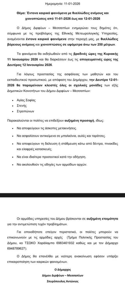 Η κακοκαιρία που θα ενσκύψει στην Εύβοια τις επόμενες ώρες με θυελλώδεις ανέμους και χιόνια προβλέπεται σύμφωνα με τους μετεωρολόγους σφοδρή. Αυτό οδήγησε πριν λίγο απόγευμα Κυριακής 11 Ιανουαρίου να εκδώσει απόφαση ο Δήμαρχος Διρφύων Μεσσαπίων Αντώνης Σπυρόπουλος για την μη λειτουργία την Δευτέρα 12 Ιανουαρίου τριών σχολείων. Ακολουθεί η απόφαση: