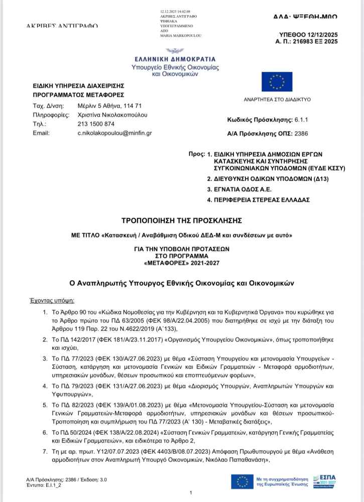 Το πρόγραμμα ενισχύθηκε με συνολική δημόσια δαπάνη που φτάνει τα 159,3 εκατομμύρια ευρώ, μέσα από τροποποίηση που υπέγραψε ο Αναπληρωτής Υπουργός Εθνικής Οικονομίας και Οικονομικών Νίκος Παπαθανάσης. Στη διευρυμένη λίστα των δικαιούχων εντάσσεται πλέον και η Περιφέρεια Στερεάς Ελλάδας, γεγονός που της επιτρέπει να προωθήσει τον φάκελο για την Παράκαμψη Βασιλικού.