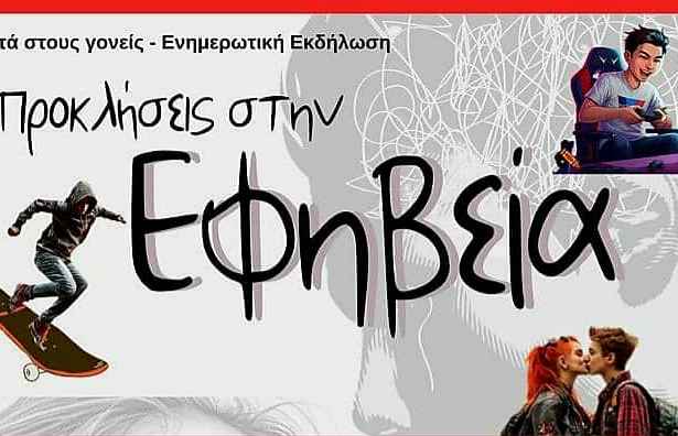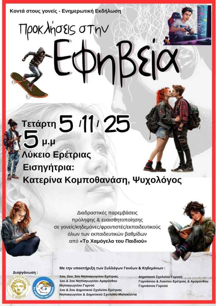 Μια ξεχωριστή ενημερωτική εκδήλωση με θέμα «Προκλήσεις στην Εφηβεία» θα πραγματοποιηθεί την Τετάρτη 5 Νοεμβρίου 2025, στις 5 το απόγευμα, στο Λύκειο Ερέτριας.
