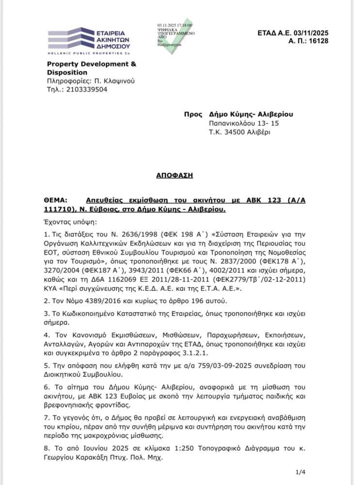 Εκδόθηκε η απόφαση της Εταιρείας Ακινήτων του Δημοσίου (ΕΤΑΔ Α.Ε.) για την απευθείας εκμίσθωση του πρώην Ειρηνοδικείου Αυλωναρίου στο Δήμο Κύμης – Αλιβερίου, με σκοπό τη δημιουργία Παιδικού Σταθμού.
