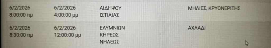 Προκειμένου να προγραμματίσετε τις εργασίες σας και να ελαχιστοποιηθεί η όχλησή σας, στον ακόλουθο πίνακα, μπορείτε να ενημερωθείτε για τις περιοχές και τις ώρες προγραμματισμένων διακοπών ηλεκτροδότησης.