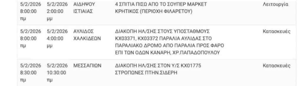 >>> Εύβοια: Πολύωρες διακοπές ρεύματος σε πολλές περιοχές τριών Δήμων την Πέμπτη