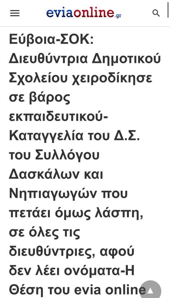“Πριν αλέκτορα φωνήσαι τρις” το evia online δικαιώθηκε για την δριμεία κριτική που άσκησε στην Ένωση Δασκάλων και Νηπιαγωγών Χαλκίδας, που τσουβάλιασε με ανακοίνωσή της, -αφού δεν ανέφερε όνομα ή σχολείο- όλες τις διευθύντριες των σχολείων της Εύβοιας, ως εν δυνάμει ύποπτες για χειροδικία προκαλώντας ζημιά στην υπόληψή τους.