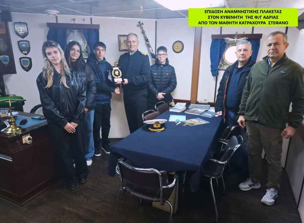 Πρώτος σταθμός της επίσκεψης ήταν η Φρεγάτα «ΑΔΡΙΑΣ» (F 459), όπου τους υποδέχθηκε αξιωματικός του πλοίου. Μετά την υποδοχή από τον Κυβερνήτη και τον Ύπαρχο, ακολούθησε παρουσίαση σχετικά με τον ρόλο, την αποστολή και τις επιχειρησιακές δυνατότητες της φρεγάτας. Οι μαθητές περιηγήθηκαν σε επιλεγμένους χώρους, όπως το ελικοδρόμιο, τη Γέφυρα και τα κέντρα ηλεκτρονικών συστημάτων, λαμβάνοντας αναλυτικές πληροφορίες για τον σύγχρονο εξοπλισμό και τη λειτουργία του πλοίου.