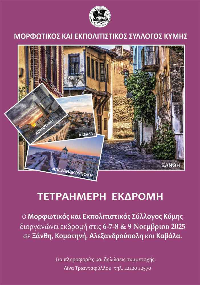 Ο Μορφωτικός και Εκπολιτιστικός Σύλλογος Κύμης διοργανώνει μια ξεχωριστή τετραήμερη εκδρομή στη Βόρεια Ελλάδα, από 6 έως 9 Νοεμβρίου 2025, με προορισμούς την Ξάνθη, την Κομοτηνή, την Αλεξανδρούπολη και την Καβάλα.