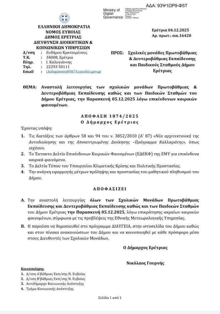 Λόγω των επικίνδυνων καιρικών φαινομένων αναστέλλεται η λειτουργία όλων των σχολικών μονάδων πρωτοβάθμιας και Δευτεροβάθμιας Εκπαίδευσης καθώς και των παιδικών σταθμών την Παρασκευή 5 Δεκεμβρίου στο Δήμο Ερέτριας.