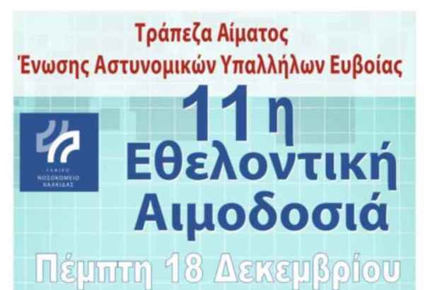 Η Τράπεζα Αίματος της Ένωσης Αστυνομικών Υπαλλήλων Εύβοιας, σε συνεργασία με το Γενικό Νοσοκομείο Χαλκίδας, διοργανώνει την 11η εθελοντική αιμοδοσία της.