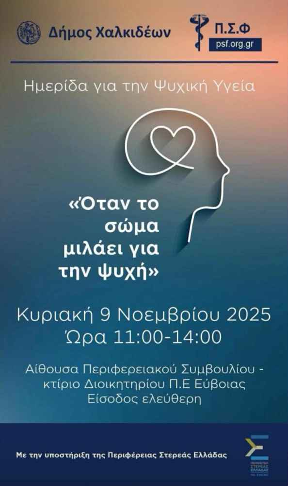 Η εκδήλωση, με τίτλο «Όταν το σώμα μιλάει για την ψυχή», θα πραγματοποιηθεί την Κυριακή 9 Νοεμβρίου 2025, από 11:00 έως 14:00, στην Αίθουσα Περιφερειακού Συμβουλίου του Διοικητηρίου της Π.Ε. Εύβοιας.