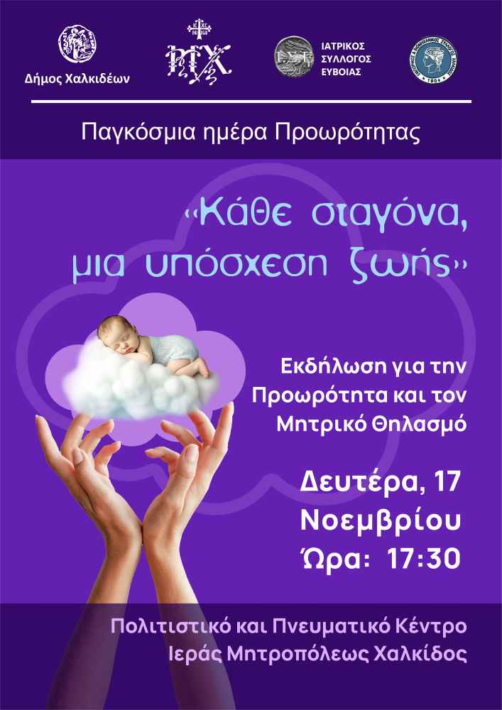 Στο πλαίσιο αυτό, σε συνεργασία με το Κέντρο Στήριξης Οικογένειας (Κ.Ε.Σ.Ο.) της Ιεράς Μητροπόλεως Χαλκίδος, τον Ιατρικό Σύλλογο Εύβοιας και τον Εμπορικό Σύλλογο Χαλκίδας, διοργανώνει την εκδήλωση με τίτλο «Κάθε σταγόνα, μια υπόσχεση ζωής», αφιερωμένη στη δύναμη του μητρικού γάλακτος και τη σημασία της φροντίδας των πρόωρων βρεφών.