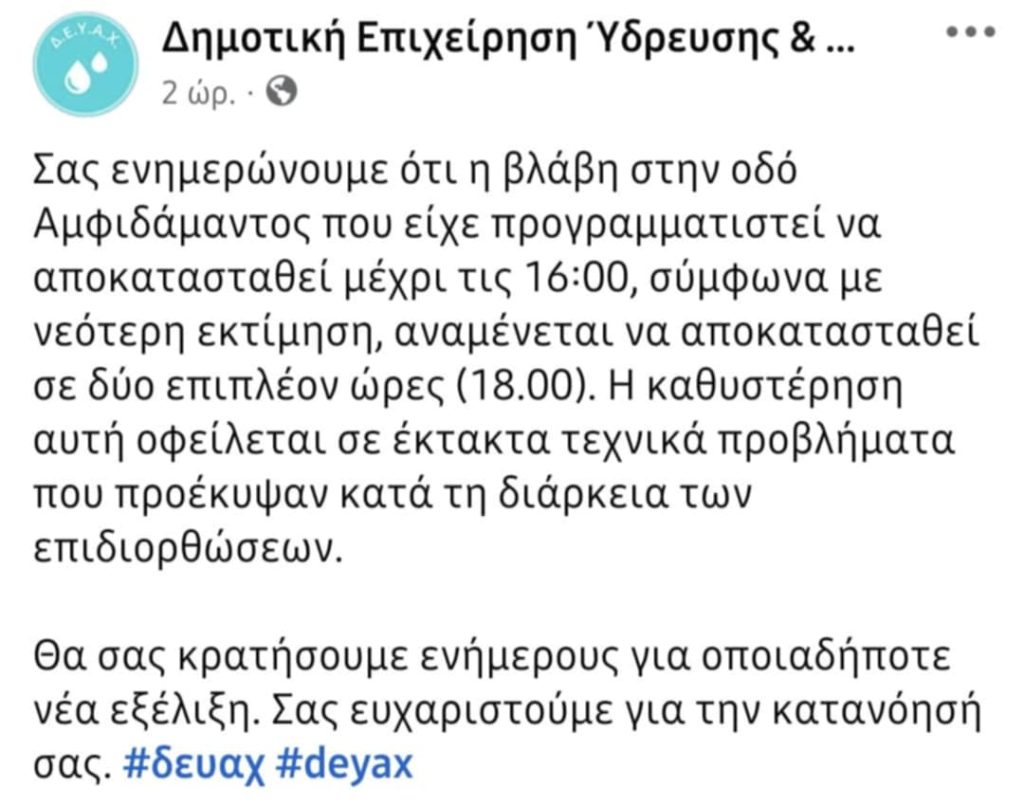 Η αρχική ενημέρωση ήταν πως η υδροδότηση θα επανέλθει στις 4 το απόγευμα και πήρε νέα αναβολή για τις 6. Με νεότερη ανακοίνωση ενημέρωνε τους πολίτες πως η υδροδότησή των περιοχών που έχουν επηρεαστεί θα επανέλθει περίπου στις 22.00.