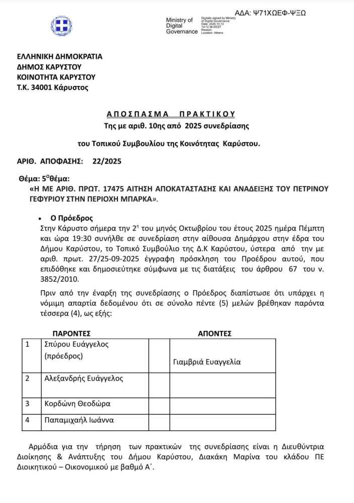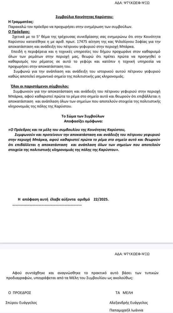 Με ομόφωνη απόφαση (22/2025) του Τοπικού Συμβουλίου της Κοινότητας Καρύστου εγκρίθηκε η αποκατάσταση, καθαρισμός και ανάδειξη του ιστορικού πέτρινου γεφυριού στη θέση «Μπάρκα», έπειτα από αίτημα της κας Σοφίας Ψυλλίογλου.