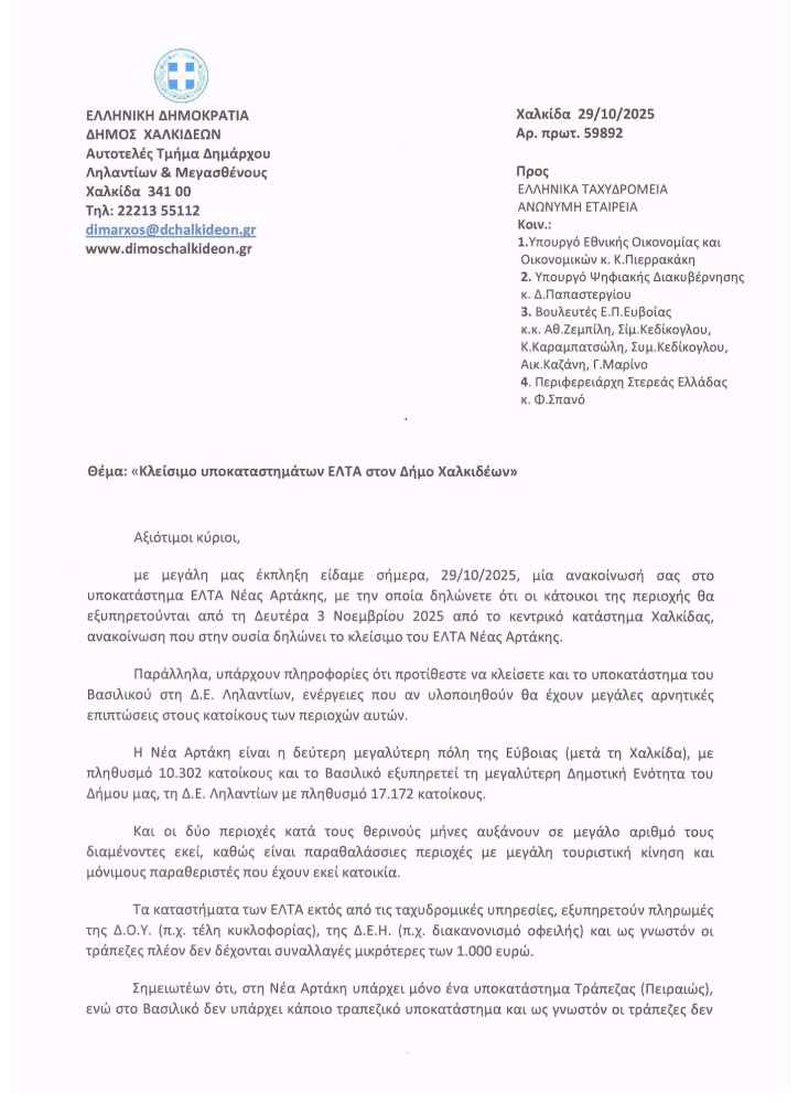 με μεγάλη μας έκπληξη είδαμε σήμερα, 29/10/2025, μία ανακοίνωσή σας στο υποκατάστημα ΕΛΤΑ Νέας Αρτάκης, με την οποία δηλώνετε ότι οι κάτοικοι της περιοχής θα εξυπηρετούνται από τη Δευτέρα 3 Νοεμβρίου 2025 από το κεντρικό κατάστημα Χαλκίδας, ανακοίνωση που στην ουσία δηλώνει το κλείσιμο του ΕΛΤΑ Νέας Αρτάκης.