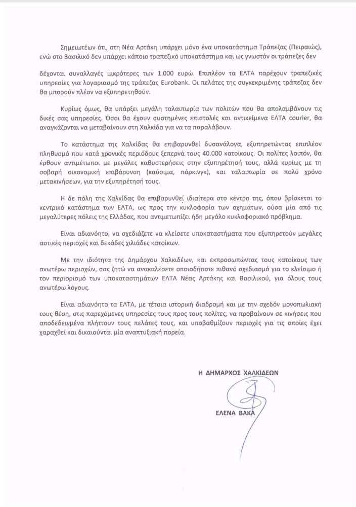 Με την ιδιότητα της Δημάρχου Χαλκιδέων, και εκπροσωπώντας τους κατοίκους των ανωτέρω περιοχών, σας ζητώ να ανακαλέσετε οποιοδήποτε πιθανό σχεδιασμό για το κλείσιμο ή τον περιορισμό των υποκαταστημάτων ΕΛΤΑ Νέας Αρτάκης και Βασιλικού, για όλους τους ανωτέρω λόγους.
