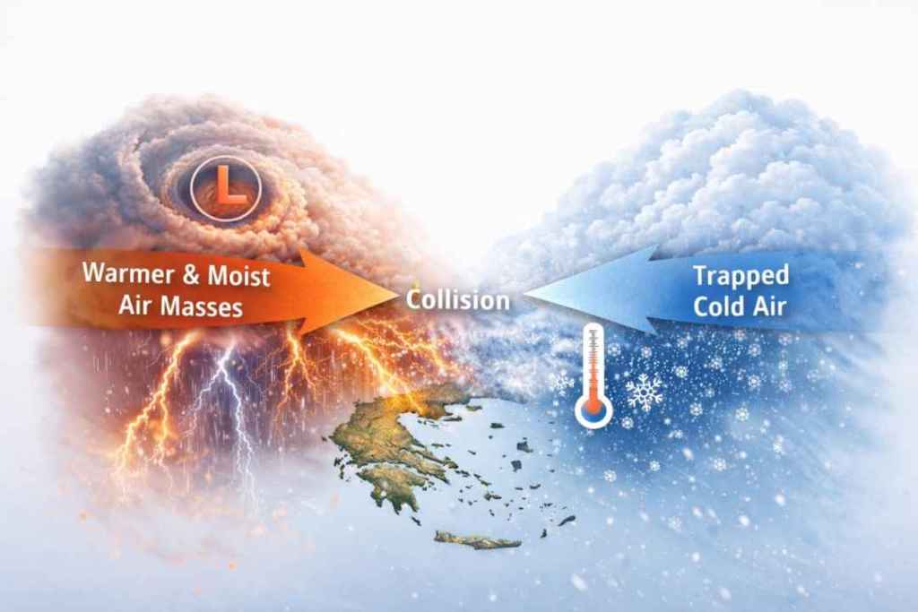 🌍 Θα υπάρχει ψυχρή, ξηρότερη αέρια μάζα κοντά στο έδαφος και στα χαμηλά στρώματα (κρύο υπόστρωμα), και από πάνω της θα αρχίσουν να εισβάλλουν θερμότερες και πολύ υγρές αέριες μάζες που συνοδεύουν το χαμηλό (υγρή τροφοδοσία).
