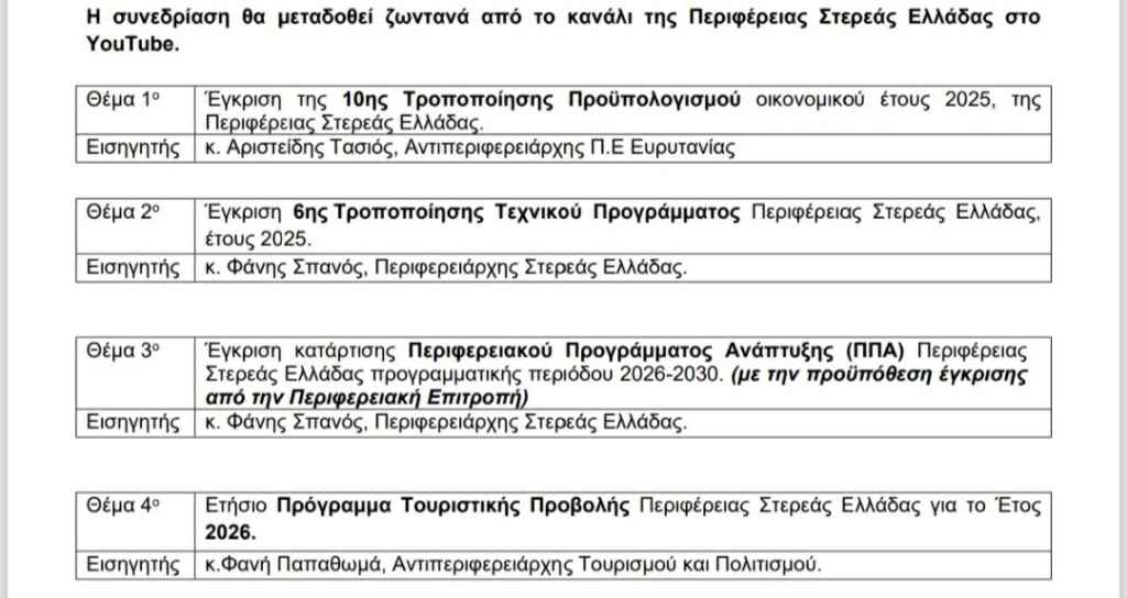 Η συνεδρίαση θα διεξαχθεί στην αίθουσα «Λάμπρου Παπαδήμα» στη Λαμία, ενώ θα μεταδοθεί ζωντανά από το επίσημο κανάλι της Περιφέρειας στο YouTube.