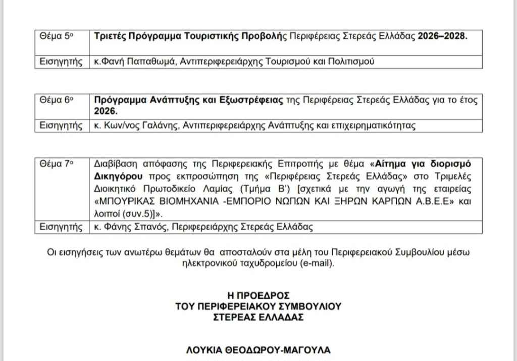 Επιπλέον, θα συζητηθεί το Πρόγραμμα Ανάπτυξης και Εξωστρέφειας για το 2026, καθώς και νομικό θέμα που αφορά τον διορισμό δικηγόρου για εκπροσώπηση της Περιφέρειας στο Διοικητικό Πρωτοδικείο Λαμίας.