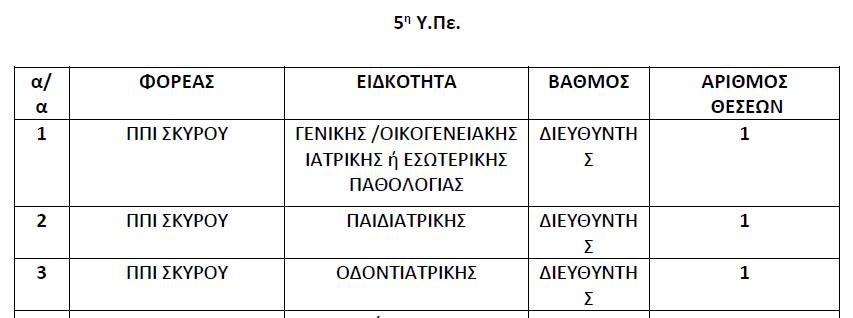 Σε μια καθοριστική προσπάθεια να ενισχύσει την υγειονομική της επάρκεια, η Σκύρος βρίσκεται σε αναζήτηση τριών μόνιμων ιατρών, έπειτα από προκήρυξη της 5ης Υγειονομικής Περιφέρειας. Οι θέσεις αφορούν Γενικό Ιατρό, Παιδίατρο και Οδοντίατρο, καλύπτοντας κρίσιμες ανάγκες του νησιού.