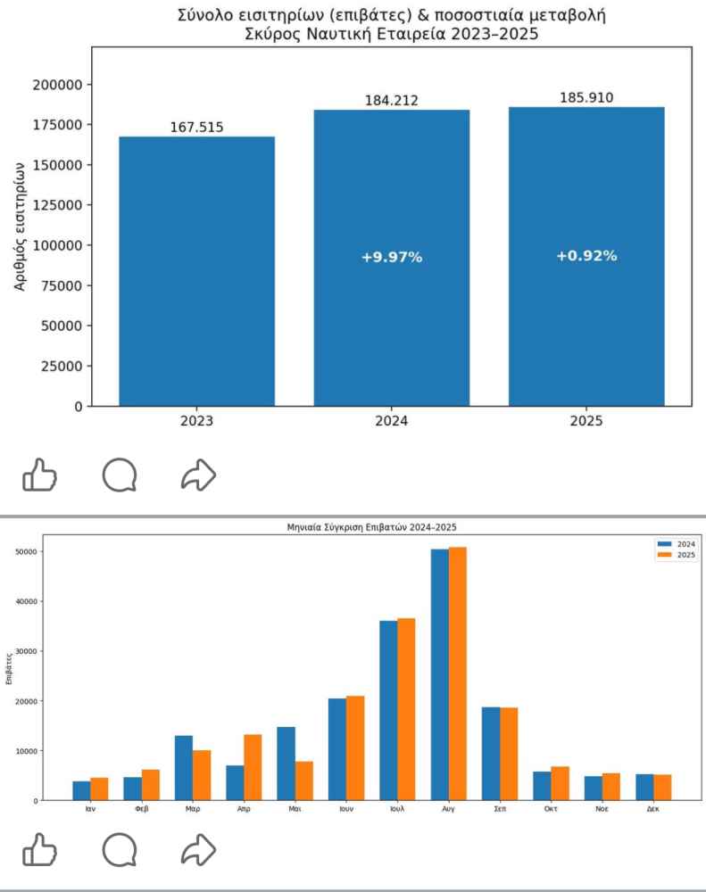 Έτος 2024 (βάση σύγκρισης – ιστορικό ρεκόρ) Επιβάτες 2024 : 184.212 Ι.Χ.: 55.270 Φορτηγά: 4.119 Επβάτες 2025 : 185.910 Ι.Χ.: 55.154 Φορτηγά: 4.609